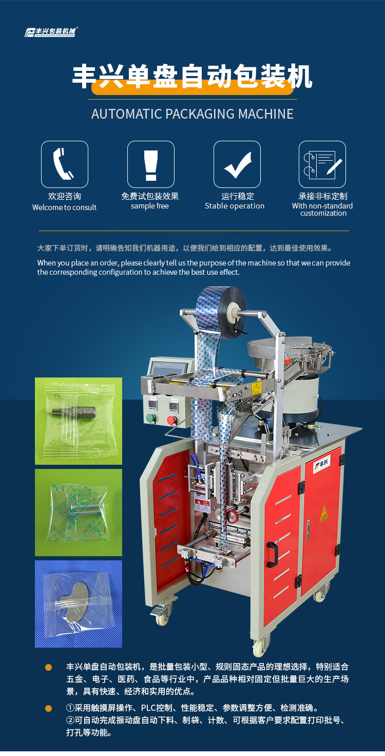 訂購熱線:0760-22122022還在為小件產(chǎn)品的包裝問題而煩惱嗎?別愁啦!豐興單個(gè)振動盤自動包裝機(jī)來幫您!這可是一款應(yīng)用極為廣泛的自動化設(shè)備,它專門針對小件物品,以及各種規(guī)則或特定設(shè)計(jì)的五金、塑料配件等進(jìn)行精心打造。